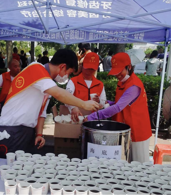 在天津市津南區(qū)咸水沽一中高考考點(diǎn)門前,來自海底撈新華城市廣場店的志愿者員工們給助力高考的一線工作人員送上清涼解暑的物資。海底撈天津區(qū)域負(fù)責(zé)人陳驍介紹,每到高考季海底撈門店都會如約提前做好志愿準(zhǔn)備工作,希望能為考生和考生家長做一些力所能及的事情。