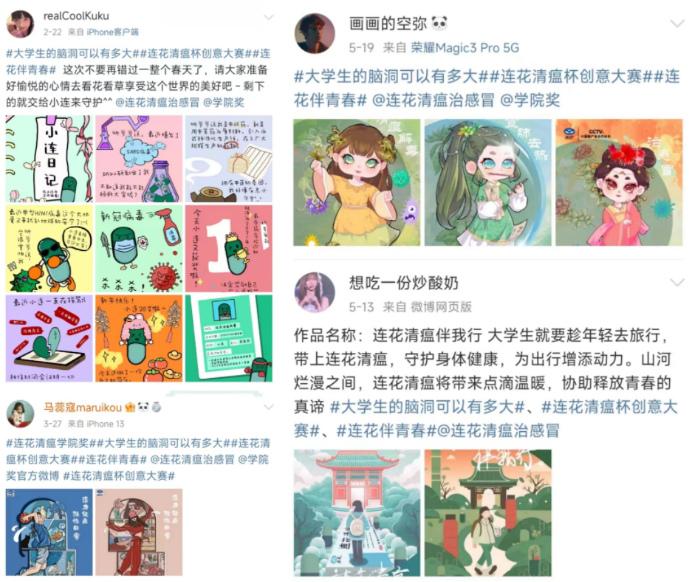 時(shí)代在發(fā)展,青年在進(jìn)步,創(chuàng)作新勢力隨著青年一代的熱血成長也在持續(xù)擴(kuò)大聲量,此次征集到的創(chuàng)意作品高燃展現(xiàn)了Z世代的創(chuàng)意腦洞,賦能連花清瘟無限青春力量。