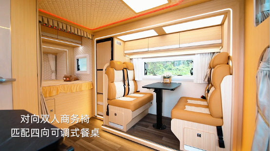 生活區(qū)精選E0級環(huán)保生態(tài)板材家具+環(huán)保地板革,部件及工藝用膠均符合TVOC標準要求,同時,配置食用級凈水箱及全車水管路,并應用車內健康環(huán)境管理系統(tǒng),融合新風、凈化及溫度調節(jié)功能,在移動的家中靜享愜意健康內環(huán)境。