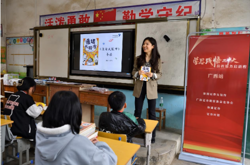 4月25日下午,“學思踐悟二十大 投教服務校園行”在浦北縣三合鎮(zhèn)橋頭小學開展。深交所、海通證券投教基地的專業(yè)人員深入各個班級進行少兒財商授課,借助由深交所投資者服務部編著的《漫話大股市》,將專業(yè)的財經(jīng)內容以通俗易懂的圖文形式傳授給小朋友們?!肮镜降资鞘裁?”“公司上市又是什么?”“有限責任公司與股份有限公司的區(qū)別在哪?”……一顆顆財商的種子在孩子們的心中生根發(fā)芽。