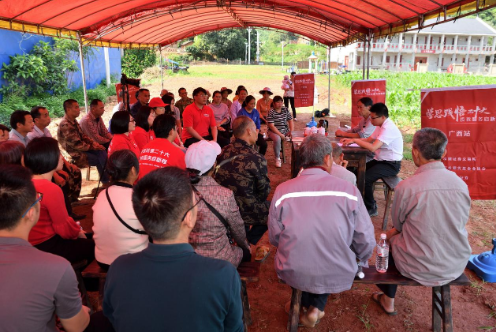 4月26日下午,活動一行人走進了浦北縣柑子根村第一黨支部。在柑子根村中心一片碧綠的田野上,擺放著整齊的板凳桌椅,村民代表相圍而坐,共同學習了一堂別開生面的“田間黨課”。