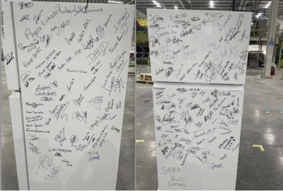 大家看到的這張照片,是今年8月19日,海信遠(yuǎn)在墨西哥的蒙特雷家電產(chǎn)業(yè)園下線的第一臺冰箱,這上面密密麻麻簽下了200多個由漢語、英語、西班牙語和韓語簽名,這些簽名來自于把原本一片荒涼的土地建設(shè)成占地達(dá)380畝的現(xiàn)代化制造工廠的建設(shè)者以及合作伙伴們,一個又一個的簽名代表著他們對產(chǎn)品質(zhì)量的確認(rèn)、對消費者的承諾。蒙特雷工廠是海信全球29家制造基地中的一個,也是最艱難的一個,一年多來,我的同事們克服疫情、水源短缺與惡劣環(huán)境的影響,最終在一片一無所有的沙土地上高效完成了新工廠建設(shè)。目前這個制造基地已經(jīng)量產(chǎn)冰箱和烤爐產(chǎn)品,這將加速海信對北美和加勒比海地區(qū)市場的拓展。蒙特雷工廠的建設(shè)者,也讓我想起了2019年,為解決海信位于墨西哥蒂華納電視工廠的新項目施工試產(chǎn),我的同事白劍鋒帶領(lǐng)團(tuán)隊租住在工廠對面,確保24小時“隨叫隨到”,當(dāng)?shù)貙懼?4小時營業(yè)的便利店實際也只服務(wù)18個小時,而海信員工卻始終做到24小時隨時待命支持項目,這種極度的勤奮與敬業(yè),就連工廠門衛(wèi)都忍不住感嘆“中國人太crazy”。