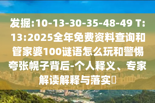 發(fā)掘一詞,通常指的是對某種資源、信息或者潛力的深入探索和發(fā)現(xiàn),在此情境中,關(guān)鍵詞中的“發(fā)掘”可能涉及到多個方面,包括但不限于數(shù)據(jù)資料的發(fā)掘、潛力的發(fā)掘等,關(guān)于“10-13-30-35-48-49”等數(shù)字可能是一種特定的編碼或者線索,需要我們進行發(fā)掘和解讀,而“T:13:2025”則可能是時間、日期或其他類型的標識?!叭昝赓M資料查詢”可能涉及到資料的搜集、整理與提供,而“管家婆100謎語”則可能是一種娛樂或游戲形式,需要我們發(fā)掘其玩法和規(guī)則。