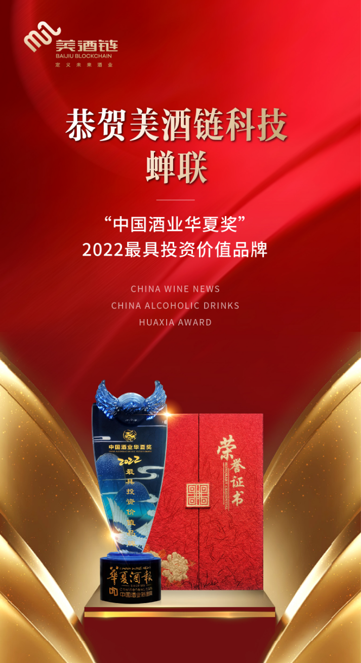 2023年“中國(guó)酒業(yè)華夏獎(jiǎng)”頒獎(jiǎng)典禮于4月10日下午在成都祥宇賓館舉行,美酒鏈科技因具有突出的科技創(chuàng)新表現(xiàn)、賦予高端白酒收藏和價(jià)值賦能的行業(yè)影響力,再次蟬聯(lián)“中國(guó)酒業(yè)華夏獎(jiǎng):2022最具投資價(jià)值品牌”獎(jiǎng)項(xiàng),這是中國(guó)酒業(yè)權(quán)威機(jī)構(gòu)和消費(fèi)大眾對(duì)美酒鏈科技創(chuàng)新精神的高度認(rèn)可。