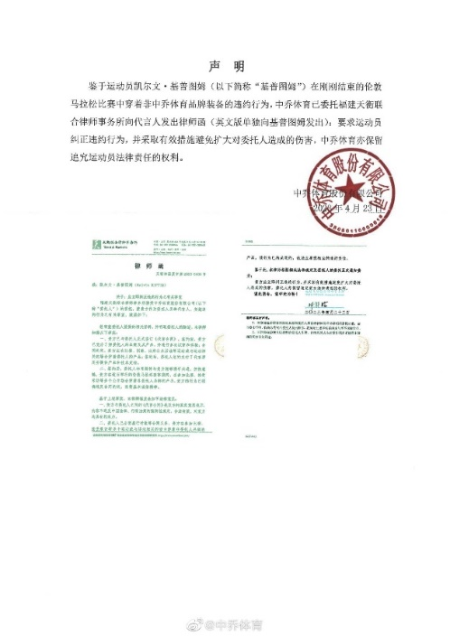 4月23日,倫敦馬拉松矚目開(kāi)跑,中喬體育品牌代言人Kelvin Kiptum (凱爾文·基普?qǐng)D姆)作為行業(yè)頂級(jí)超新星以及中國(guó)品牌代言人自然備受關(guān)注。最終Kelvin Kiptum (凱爾文·基普?qǐng)D姆)在比賽中發(fā)揮出色斬獲冠軍,再度刷新個(gè)人PB并獲得馬拉松賽事領(lǐng)域歷史第二名的佳績(jī);但同時(shí),他卻并未按照代言合約穿著賽場(chǎng)裝備。這一違約行為引發(fā)重大爭(zhēng)議,同時(shí)也使得中喬體育的品牌利益受到重大損害。