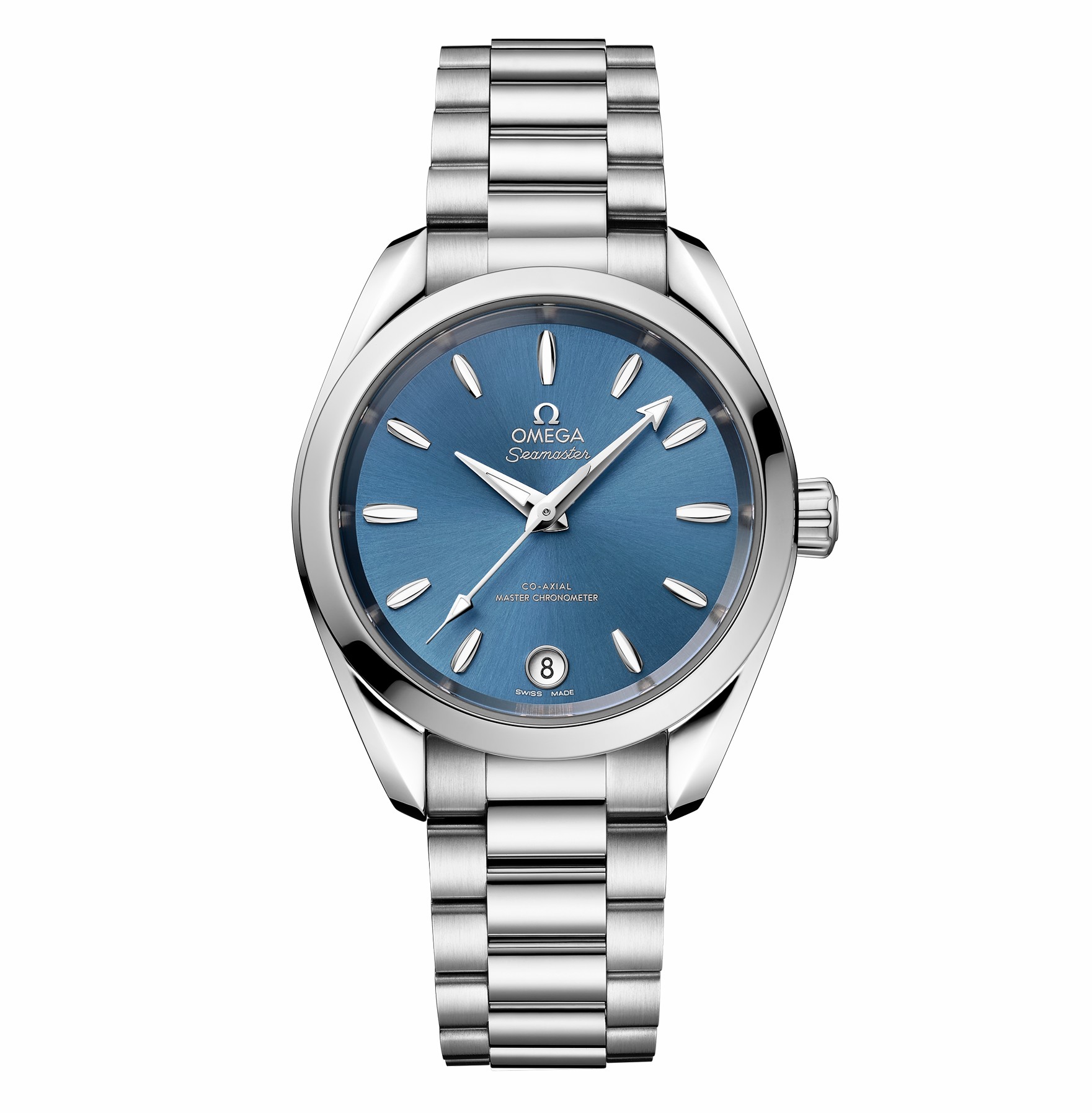 對于女性而言,Aqua Terra 150米34毫米至臻天文臺表或許會更加得心應手一點吧。其整體內(nèi)外的設計基本延續(xù)了36毫米款的特征,變化主要在于盤面的色彩,如貝殼粉色凸顯出其時尚的柔美,而海藍色表盤則有剛柔并濟的味道,兩者都帶有明顯的婉約色彩,可能頗投女性的眼緣吧。此外,其指針、小時刻度和歐米茄品牌標識均以拋光白色18K金制成,6點位的日歷窗由硬朗的梯形變成可愛的圓形,無疑強化了其女表的色彩。