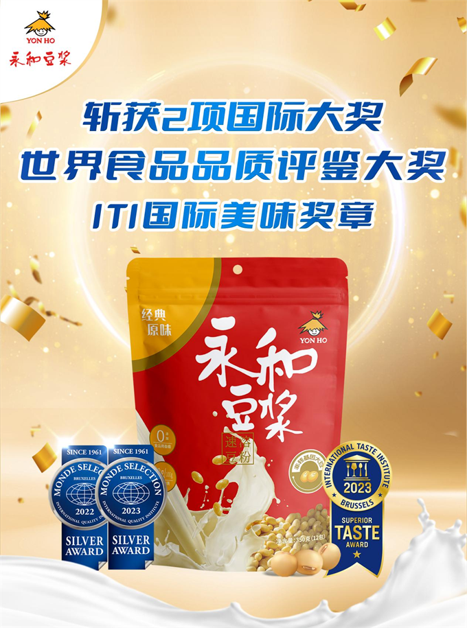 永和豆?jié){一路走來,不斷追求卓越品質(zhì),積極對標嚴格的國際標準,打造營養(yǎng)美味的豆?jié){產(chǎn)品。2022-2023年,永和豆?jié){旗下經(jīng)典原味豆?jié){粉350g憑借專業(yè)配方和匠心工藝,連續(xù)斬獲蒙特獎和ITI國際美味獎,閃耀世界舞臺。